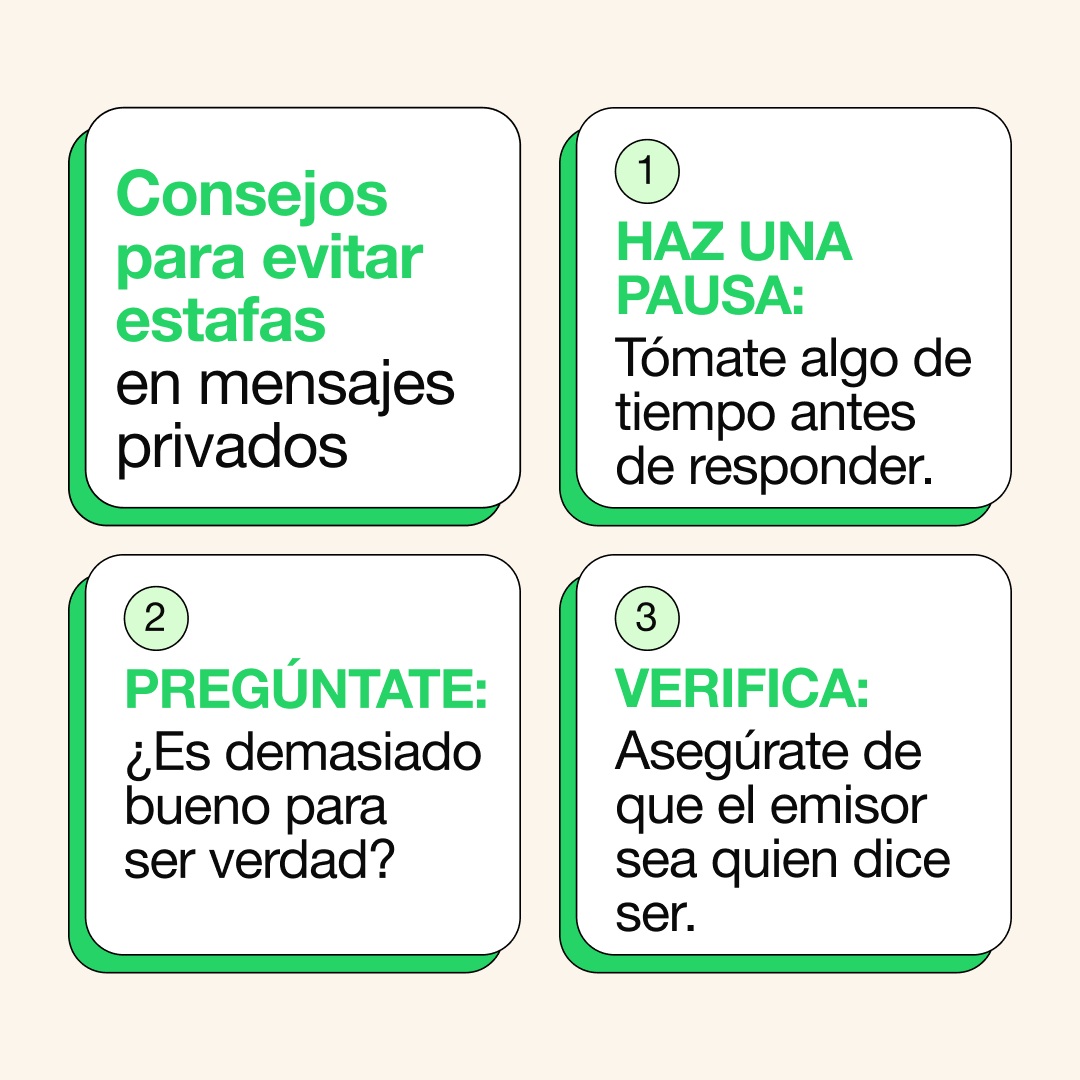 - Duda. ¿Tiene sentido la solicitud? ¿Es demasiado buena para ser verdad? ¿Te piden que envíes dinero, tarjetas de regalo o códigos PIN? ¿Te ofrecen un pago extremadamente elevado por solo unas pocas horas de trabajo? ¿Te apuran para que actúes? Todas estas podrían ser señales de una estafa.
