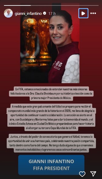 En redes sociales, y ante la celebración del Mundial 2026 en México, Estados Unidos y Canadá, Infantino destacó que “la emoción se siente en el aire, con Guadalajara y Monterrey listos para dar la bienvenida al mundo, y el icónico Estadio Azteca en Ciudad de México preparándose para hacer historia al albergar su tercera Copa Mundial de la FIFA”.