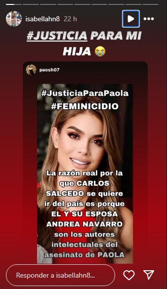 Por medio de su cuenta de Instagram, la señora Isabel acusó a Carlos Salcedo de querer salir de México “porque él y su esposa Andrea Navarro son los autores intelectuales del asesinato de Paola“.