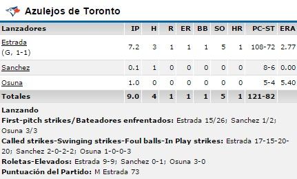 Marco Estrada fue el inicialista de los Azulejos. A lo largo de siete entradas y dos tercios, el mexicano permitió tres hits, una carrera limpia y un jonrón. Además ponchó a cinco y dio una base por bola. En total registró 108 lanzamientos.