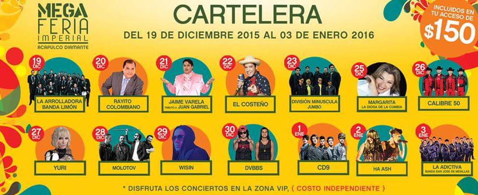 La cartelera quedó conformada por La Arrolladora Banda Limón (19 diciembre), Rayito Colombiano (20), Jaime Varela, imitador de Juan Gabriel (21), ”El Costeño” (22), División Minúscula y Jumbo, que se presentarán el día 23.