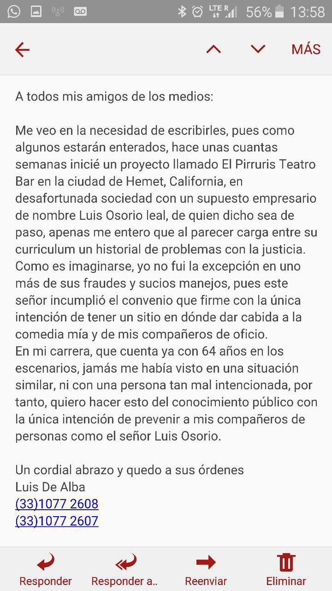 A través de redes sociales, diversos actores han difundido un correo que les hizo llegar el comediante, señalando que para iniciar el proyecto llamado “El Pirruris Teatro Bar” en la ciudad de Hemet, California, realizó una “desafortunada” sociedad con Luis Osorio Leal.