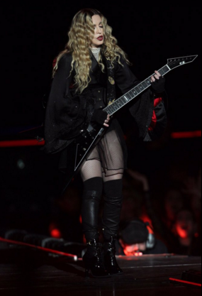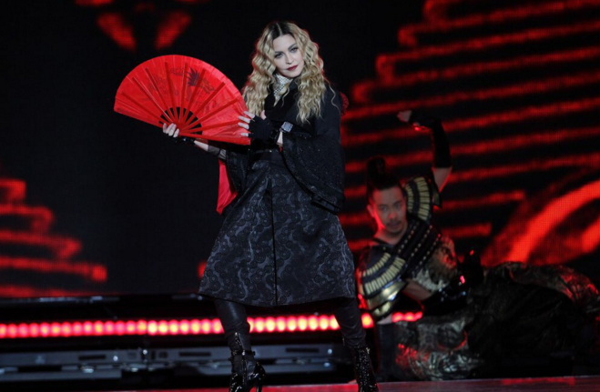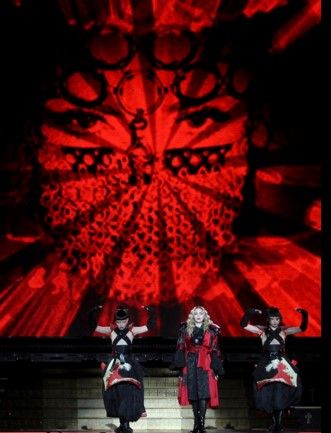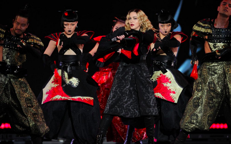 Custodiada por los samuráis vestidos de dorado y grandes cruces, la diva de 57 años, que usó un vestido rojo con toques negros y su largo cabello rubio suelto, hizo la coreografía del primer tema de esta gira en la que la energía electrónica tomó gran fuerza.