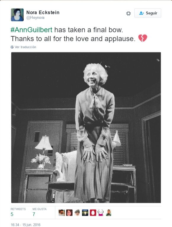 Ha sido su hija, Nora Eckstein, quien confirmara a través de su cuenta de Twitter, donde publicó: “#AnnGuilbert aceptó un saludo final. Gracias a todos por el cariño y aplauso”.