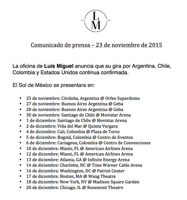 Ayer, la oficina de Luis Miguel confirmó que la gira del cantante por Argentina, Colombia, Chile y Estados Unidos se mantiene en pie.