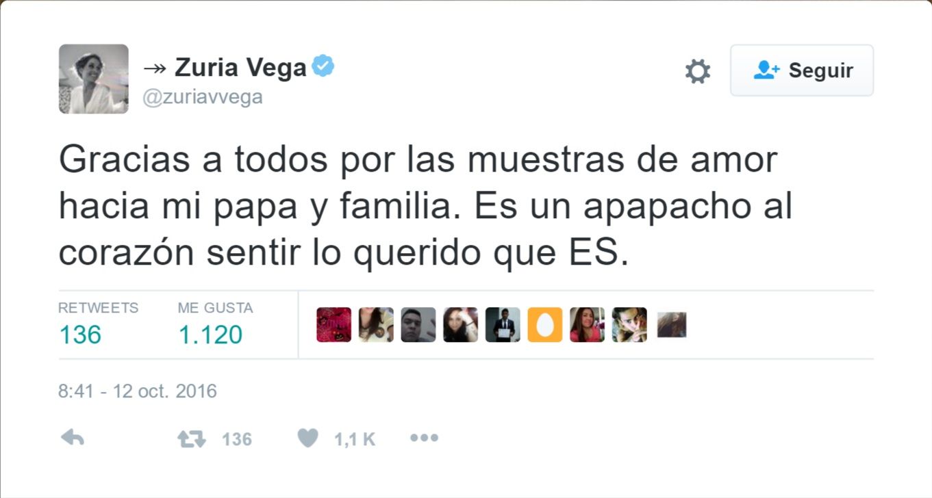 A través de su cuenta de Twitter, publicó un mensaje donde agradeció a todos los que han podido dejarle un mensaje de apoyo tanto a ella como a su familia.