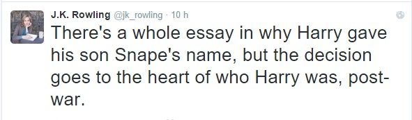 La autora J.K. Rowling recurrió a Twitter el viernes para responder a la pregunta persistente de por qué el hijo de Harry se llama Severus de segundo nombre.