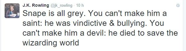 “Snape es todo gris. No puedes convertirlo en santo: era un bully vengativo. No puedes convertirlo en demonio: murió para salvar el mundo de los brujos”, tuiteó Rowling.