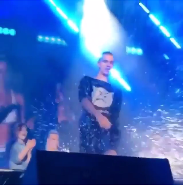 El canadiense se encontraba pateando el agua en el piso como parte de una coreografía de la canción “Sorry” cuando terminó por caer frente a miles de personas quienes ansiosamente esperaban que el cantante se levantara.
