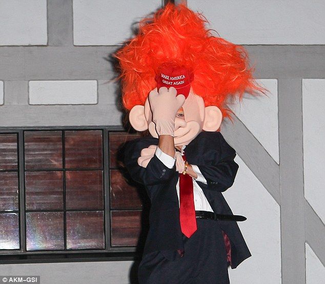 El actor británico de 39 años se puso una divertida peluca naranja y una máscara, acompañada de una gorra con la leyenda “Make America Great Again”, así como unos pies enormes (en juego con la máscara) en vez de zapatos.