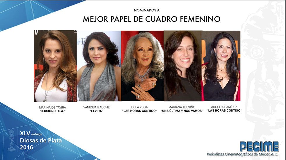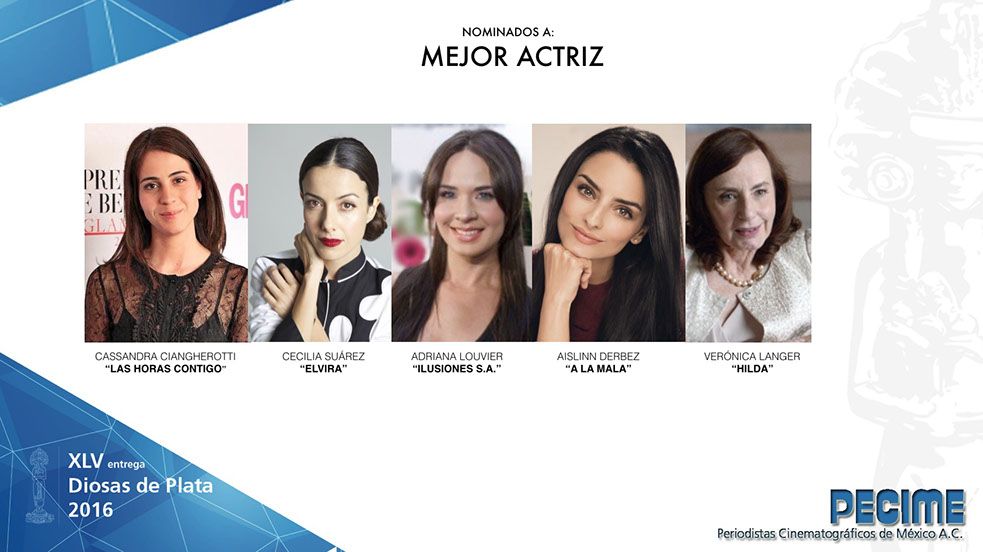 En tnato, Cassandra Ciangherotti (Las horas contigo), Cecilia Suárez (Elvira, te daría mi vida pero la estoy usando), Adriana Louvier (Ilusiones S.A.); Aislinn Derbez (A la mala) y Verónica Langer (Hilda), se enfrentarán para conseguir la Diosa de Plata “María Félix” a mejor actriz.