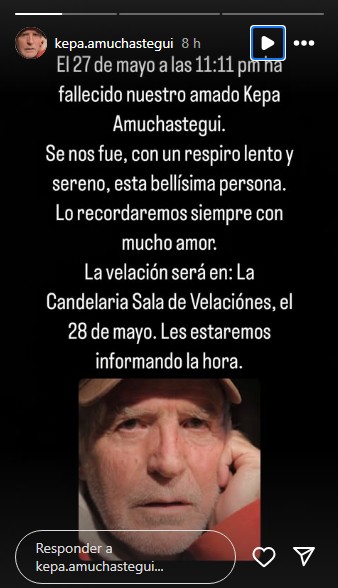 “El 27 de mayo a las 11:11 p.m. ha fallecido nuestro amado Kepa Amuchastegui. Se nos fue con un respiro lento y sereno esta bellísima persona. Lo recordaremos siempre con mucho amor”, escribió su hijo Unai Amuchastegui en redes sociales.