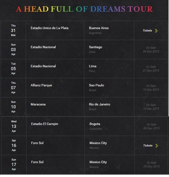 Quizás a manera de compensación, debido a que no salieron de gira con su anterior disco, la banda inglesa Coldplay anunció el pasado 19 de noviembre que hará una extensa gira mundial para promocionar su nuevo álbum, A Head Full Of Dreams.