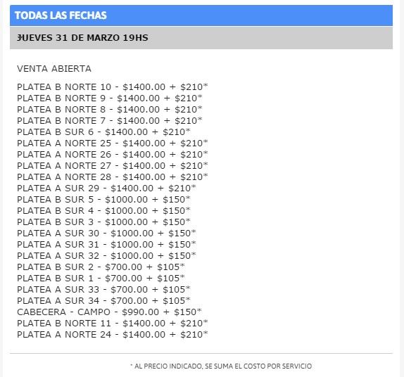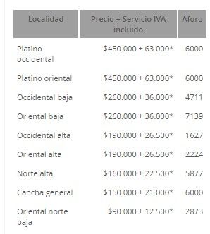 La información hasta ahora liberada es que las entradas saldrán a la venta el próximo 4 de diciembre y tendrán un precio que irá de los 36.92 dólares hasta los 184.60 dólares. Habrá ocho secciones, entre ellas Cancha General y Cancha VIP.