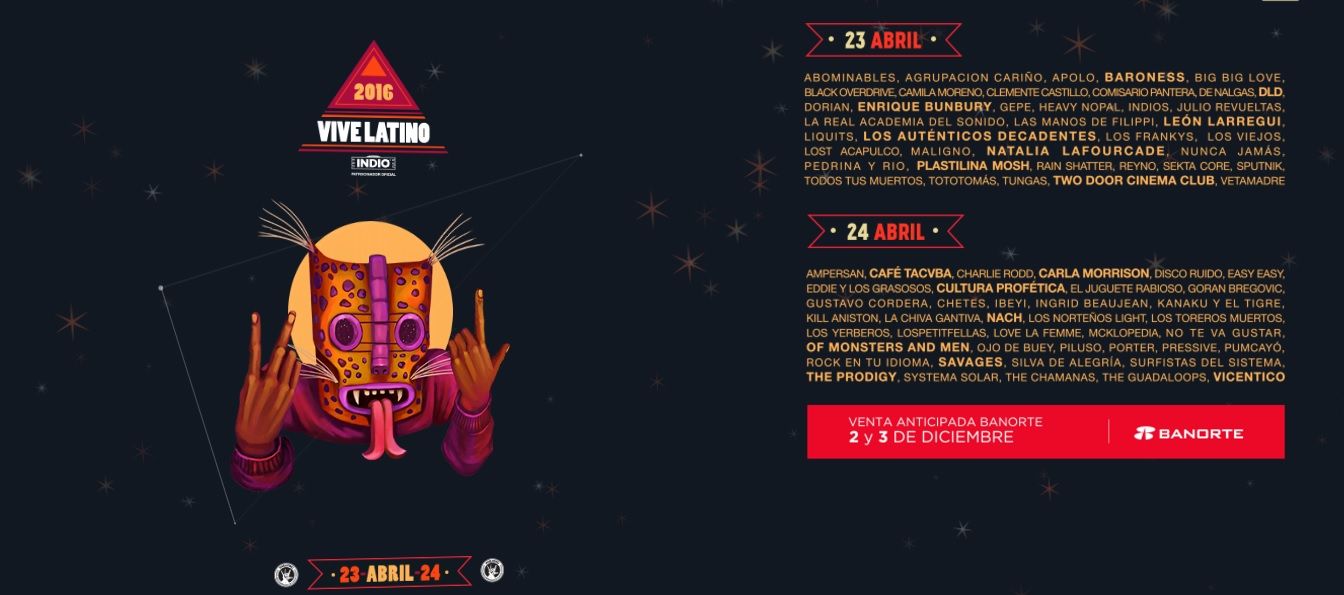 El próximo Festival Iberoamericano de Cultura Musical Vive Latino en su Edición 17 ha presentado ya su cartel oficial del evento a realizarse el próximo 23 y 24 de abril de 2016, con un elenco que promete figuras nacionales como internacionales de primer nivel que harán bailar a los miles de espectadores que acudan al Foro Sol.