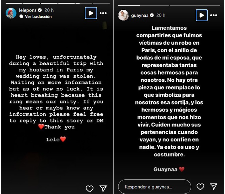 Lele Pons denunció el robo de su anillo de bodas en París, y pidió ayuda para recuperarlo