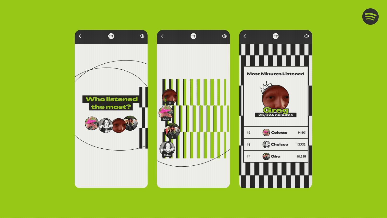 • Top Artist Sprint: Observa el sprint hacia tu primer puesto. Esta historia visualiza cómo tus cinco artistas favoritos han evolucionado en tu ranking personal mes a mes.