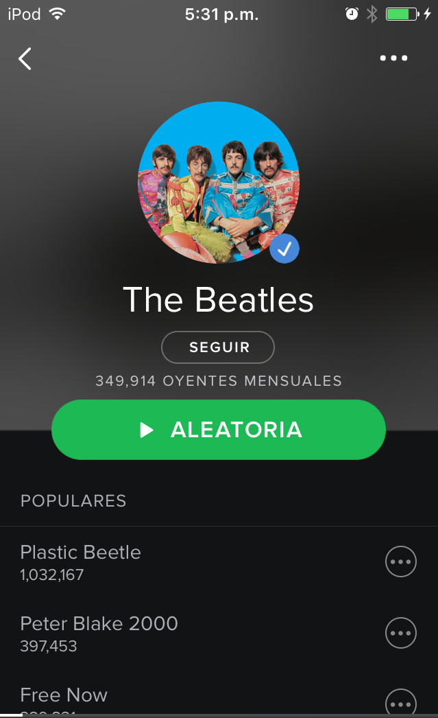 Ahora, The Beatles tendrá que medirse en Spotify con ídolos de masas actuales como el canadiense Justin Bieber, el interprete más popular de este servicio al contar con 31,7 millones de oyentes mensuales y cuya canción ‘Sorry’ se encuentra en la cima de las canciones más escuchadas, con 3,8 millones de reproducciones diarias.