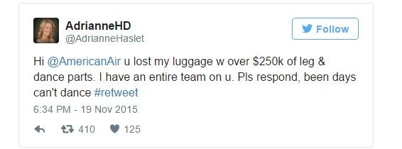 Ella así lo dio a conocer a través de un tuit que publicó ayer por la noche. “Hola @AmericanAir perdieron mi equipaje de más de 250 kilos con mi pierna y artículos de baile. Tienen mi equipo completo. Respondan por favor, han sido días sin poder bailar”, escribió.