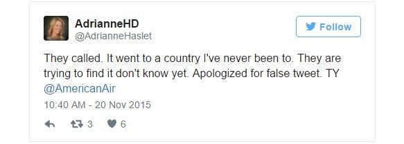Haslet-Davis tuiteó el día de hoy que su equipaje “estaba en un país al que nunca ha ido” y comentó que la aerolínea estaba tratando de encontrarlo.