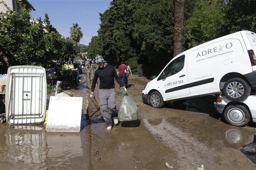 Torrentes de agua lodosa inundaron caminos, edificios y vías férreas interrumpiendo el movimiento en la costa del Mediterráneo el domingo.