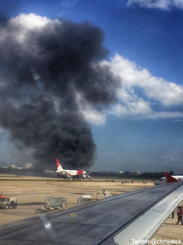 “Me han dicho que uno de los motores se incendió cuando el avión estaba preparándose para partir. No sé el número de personas a bordo, y no sé la condición de las personas, pero me informaron que el fuego fue apagado por un equipo de rescate”, dijo.
