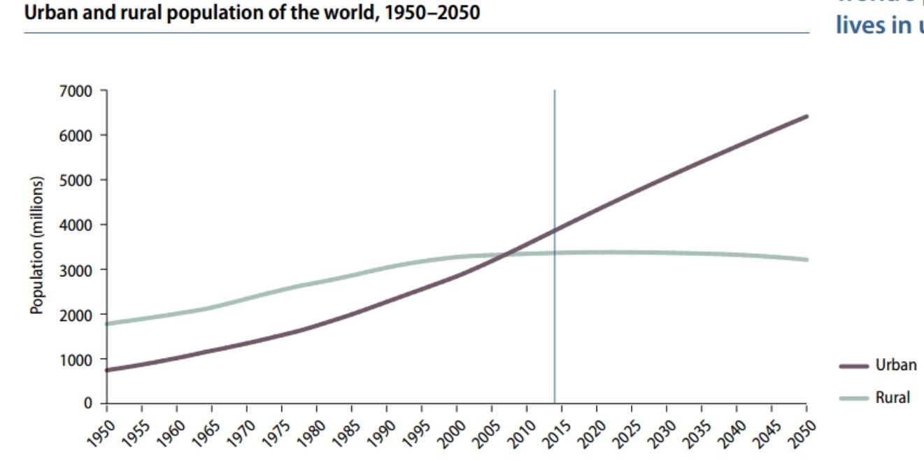 Siguiendo la proyección de que en 2050 la población total de la Tierra alcanzará los 9 mil millones de personas, se verá que el 66 por ciento del total habitantes vivirán en asentamientos urbanos, en contraste con el 34 por ciento de quienes vivirán en asentamientos rurales.