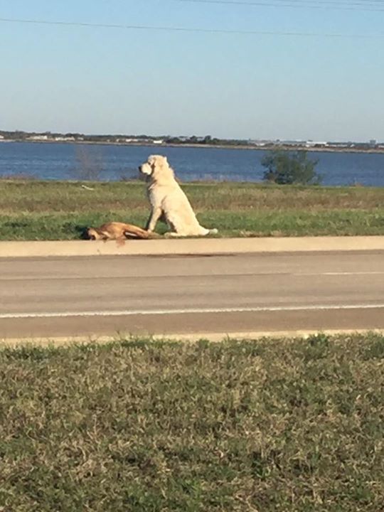 Un perro se quedó sentado esperando a que rescataran a su amigo muerto, tal vez arrollado por un camión en Dallas