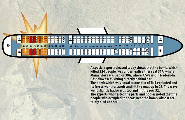 La primera posibilidad es el asiento 31A. María Ivleva, una niña de 15 años de edad, podría haber estado sentada sobre los explosivos que tenían el poder de un kilo de TNT.