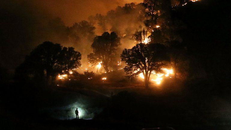 Rocky. Un bombero lucha contra el Fuego Rocky, un incendio que se extendió por tres condados de California y quemó más de 60.000 acres.