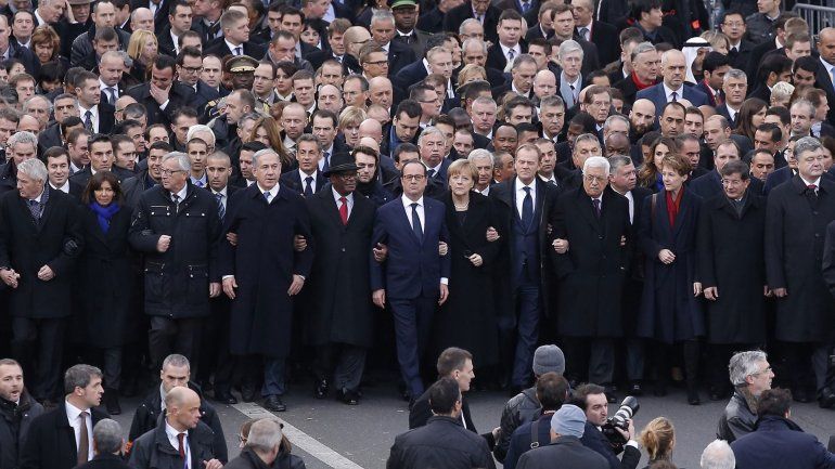 La foto de enero. Más de 40 líderes mundiales marcharon en París, Francia, en honor a las 17 víctimas de los ataques terroristas contra el semanario satírico Charlie Hebdo y un supermercado judío.