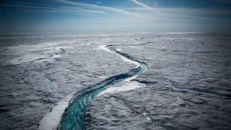 Groelandia en julio. El agua de un río fluye a través de una capa de hielo de Groenlandia, uno de los glaciares más grandes y de más rápido derretimiento en la Tierra.