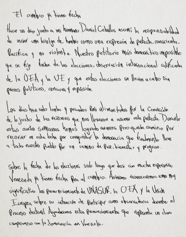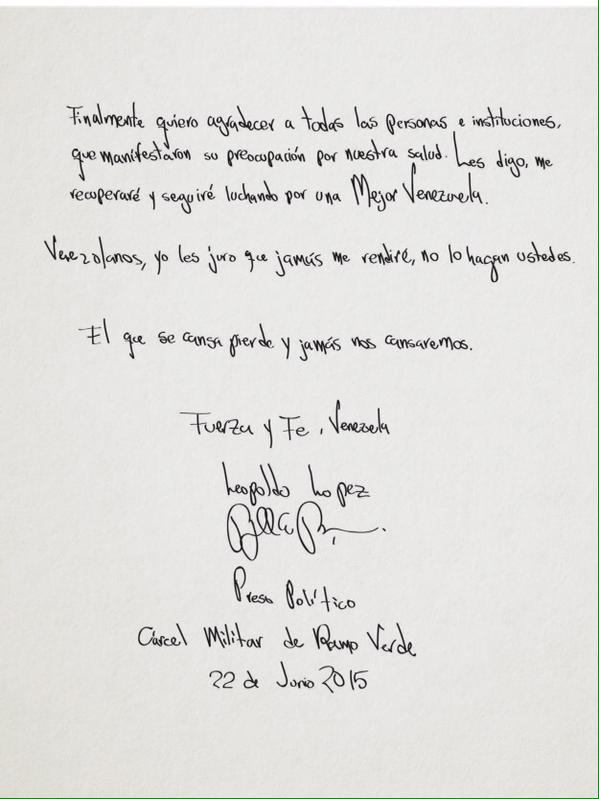 “En nombre del amor que nos une, por tus hijos, por todos los venezolanos que tenemos puesta nuestra esperanza en ti para lograr la mejor Venezuela, te pido que levantes la huelga de hambre. Te queremos fuerte. Queremos que te levantes con más voluntad para luchar por Venezuela”.