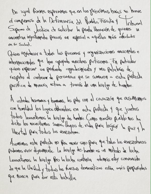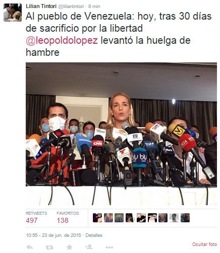 Tintori leyó un mensaje de su marido ante los medios: “Quiero agradecer a quienes se sumaron a esta protesta de manera activa a través de una huelga de hambre. Ahora les pido que levantemos la huelga de hambre. Los necesitamos sanos, llenos de vida, para lograr la paz y la libertad para todos los venezolanos. La lucha continúa”.