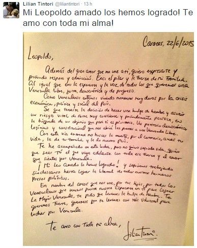 Ayer, Tintori publicó la carta que ella le escribió a Leopoldo López en donde le pedía que dejara de ayunar: