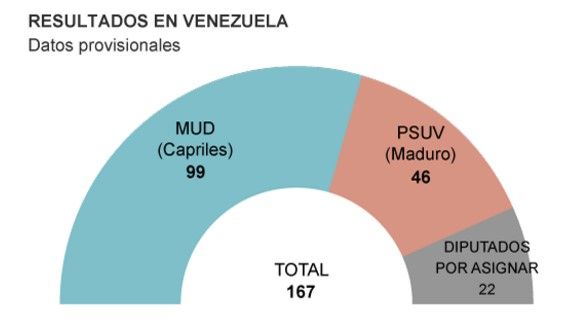 Según precisó el CNE, el PSUV y sus aliados obtuvieron 24 representantes nominales y 22 por lista, para un total de 46 diputados, mientras que la MUD contaba con 72 representantes nominales y 27 por lista, para sumar 99 diputados, y faltaba por adjudicar 19 escaños.