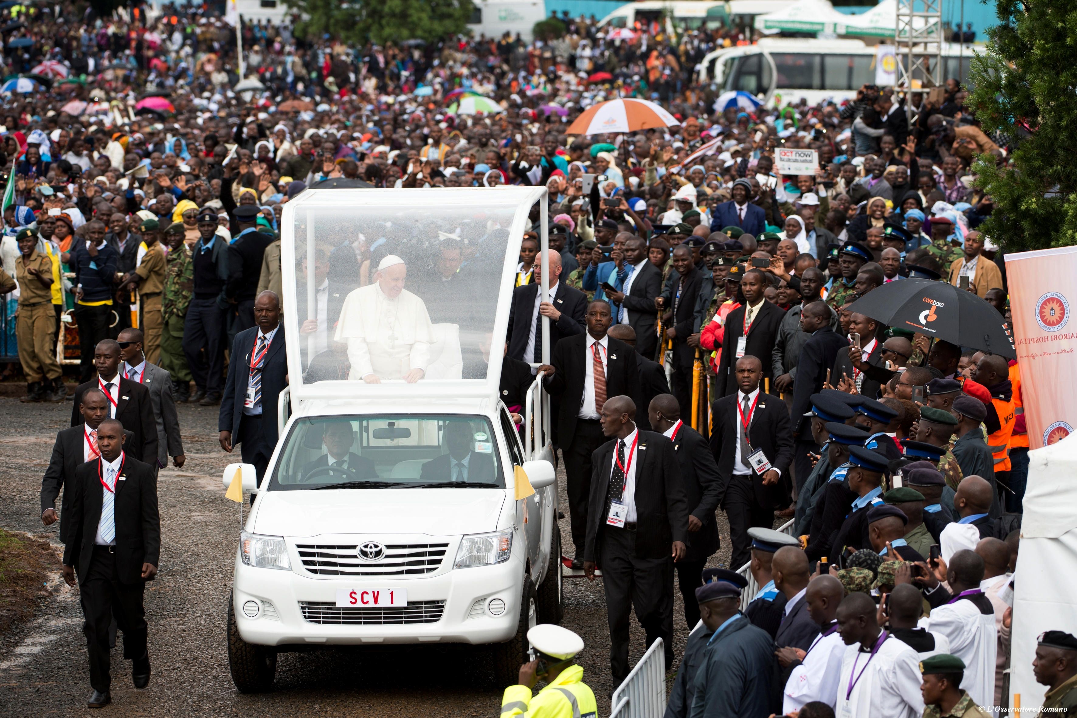 En su primer día completo en Kenia, Francisco recibió una ruidosa bienvenida de la multitud desde su papamóvil abierto, mientras unos 10 mil agentes de policía servían de guardia de seguridad.