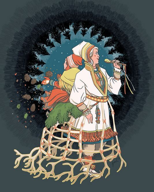 Según la tradición, Beiwe y su hija caminan por el cielo sobre huesos de reno con lo que provocaban el nacimiento de las plantas en el suelo.