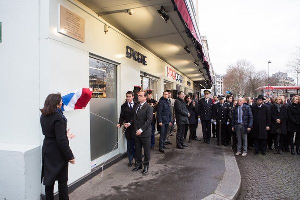 La tercera placa fue develada en la fachada del supermercado judío “Hyper Cacher”, en donde fallecieron cuatro personas en el asalto con rehenes al final de la oleada de atentados, el nueve de enero.