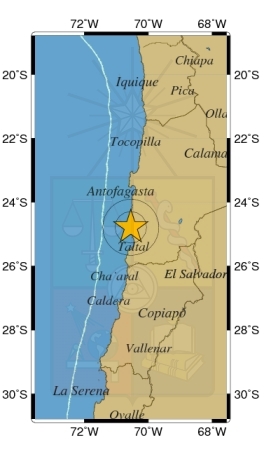 Alrededor de las 18:00 h, tiempo local chileno, un movimiento telúrico tuvo epicentro en la Región de Antofagasta, a 70 kilómetros al norte de la localidad de Taltal.