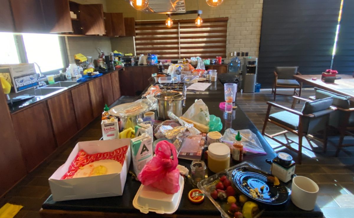 Cruzando la puerta se encuentran la cocina y comedor, donde habían numerosos alimentos como frutas y leche, además de contenedores de unicel y cartón propios de comida para llevar.