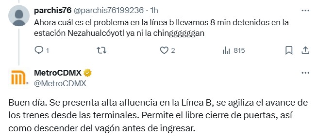Esta mañana de jueves, usuarios reportaron servicio lento en la Línea B del Metro CDMX.