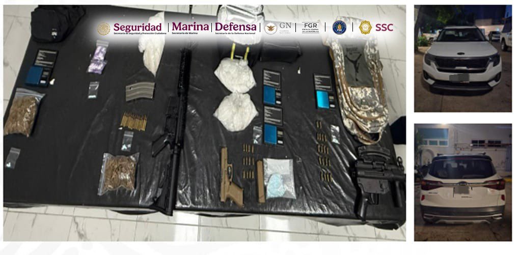 A los hombres se les aseguraron tres armas de fuego de diferentes calibres, 51 cartuchos útiles, cuatro básculas grameras, 80 dosis y medio kilogramo de una sustancia similar al crystal, 50 gramos de pastillas de lo que pudiera ser fentanilo y dos bolsas con hierba verde similar a la mariguana con aproximadamente 165 gramos.