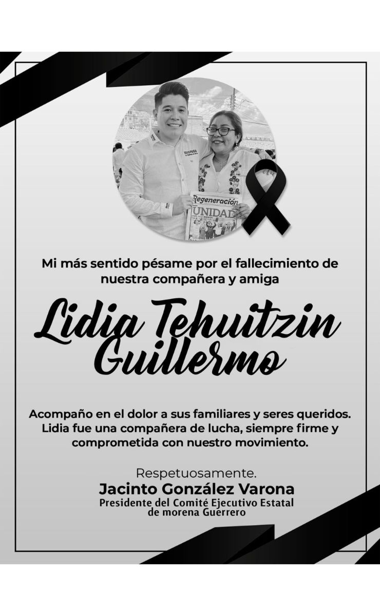 La muerte de la excandidata a la Presidencia Municipal de Zitlala fue confirmada por Jacinto González, dirigente estatal de Morena.