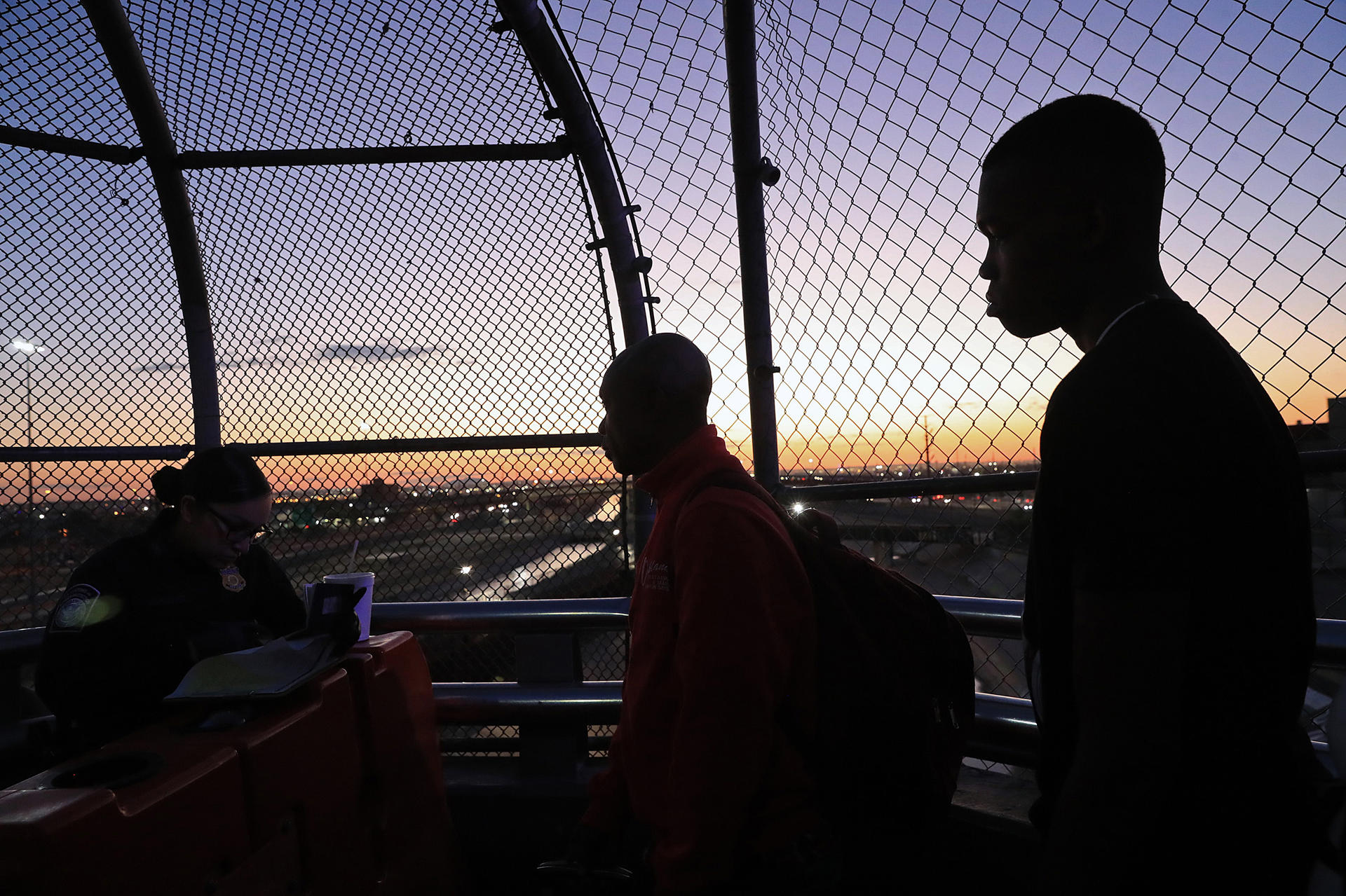Los oficiales guían a los migrantes a través de los diferentes puntos de control para que completen los trámites migratorios requeridos.