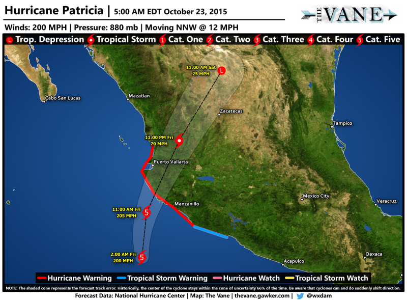 En un período de 24 horas, del jueves al viernes, Patricia pasó de la categoría 1 con vientos de 136.7 km/h a la 5 con vientos de 325.8 km/h.
