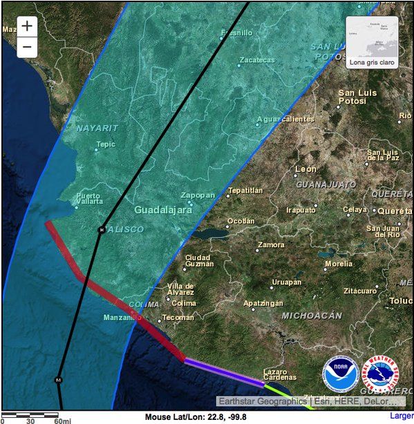Su amplia circulación generará potencial de tormentas de intensas, de 75 a 150 milímetros, a puntuales torrenciales de 150 a 250 mm en el centro y el sur de Colima y Jalisco y el sur de Michoacán, informa el Servicio Meteorológico Nacional (SMN), dependiente de la Comisión Nacional del Agua (Conagua). También provocará lluvias intensas de 75 a 150 mm en el sur de Durango y Zacatecas, el sur y el oriente de Nayarit, la mayor parte de Aguascalientes y la sierra y el sur de Guerrero y el sur y el occidente Guanajuato, así como lluvias fuertes de 25 a 50 mm en Sinaloa, Distrito Federal, Estado de México, Morelos y Querétaro.