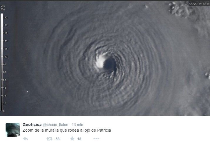 Alberto Hernández Unzón señaló que Patricia tiene anillos concéntricos y vórtices (rotación en espiral), en el interior del ojo del superhuracán y probablemente generará trombas y tornados a su paso