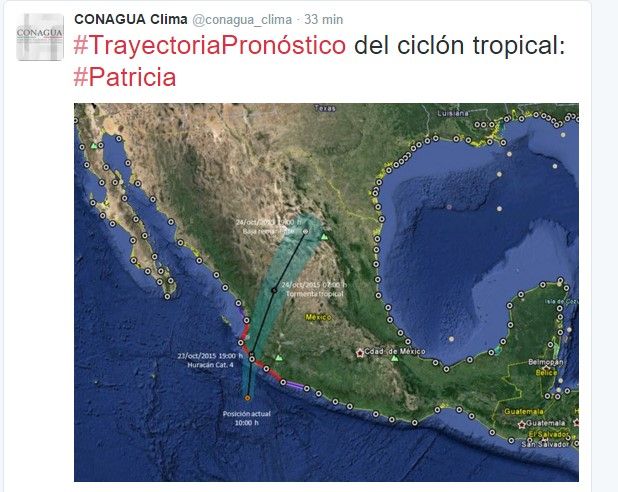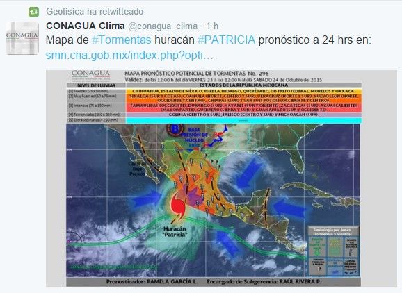 El pronóstico es que atravesará todo el territorio nacional, informó Roberto Ramírez de la Parra, director de CONAGUA. Señaló en conferencia de prensa que Patricia es tan grande, que incluso llegaría al otro lado del territorio nacional, es decir, al Oceano Atlántico.