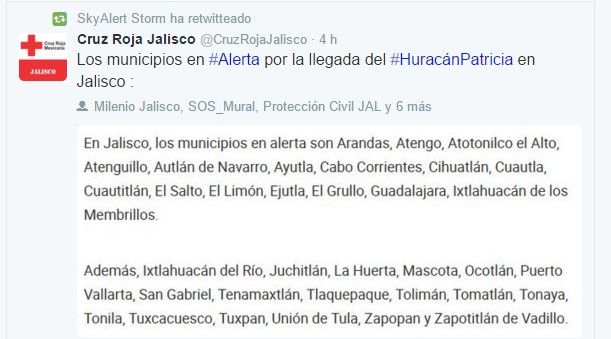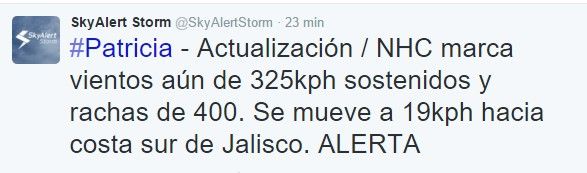 En entrevista radiofónica en el espacio de Joaquín López-Dóriga, el ingeniero Alberto Hernández Unzón, gerente de Meteorología y Climatología del Sistema Meteorológico Nacional (SMN), informó que el Huracán Patricia presenta en estos momentos vientos de 350 km/h, por lo que se ha alcanzado una, “intensificación mayor. Yo llamaría categoría 5 Plus. En escala planetaria, porque ya sobrepaso el 5 fácilmente”.